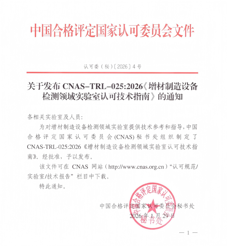 为对增材制造设备检测领域实验室提供技术参考和指导,中国合格评定国家认可委员会(CNAS)秘书处组织制定了CNAS-TRL-025:2026《增材制造设备检测领域实验室认可技术指南》。经批准,予以发布。